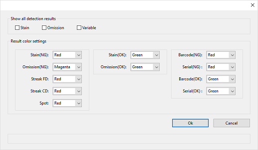 [Result color settings] | [Stain(NG)] | Sets the color of the frame to enclose image failures such as stains, omissions, streaks, or spots. |