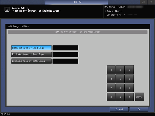 Control panel - Utility/Counter - [Administrator Setting] - [Common Setting] - [Setting for Inspect. Of Excluded Areas] | |||