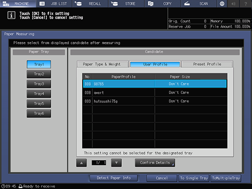The selected paper profile is reflected in the [Paper Tray] field on the [MACHINE] screen.