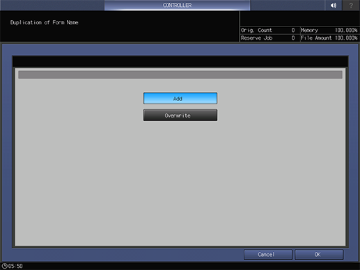 Touch panel - [MACHINE] - [Controller] - [Driver Print Setting] - [Duplication of Form Name]