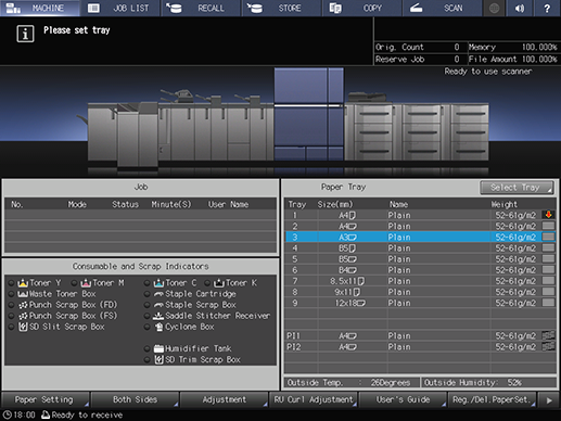 The remaining amount of paper in each paper tray is displayed on the [MACHINE] screen.