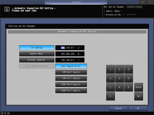 You can check or change settings by accessing, in order, Control panel, Utility/Counter, [Administrator Setting], [Network Setting], and then [Auto Inspection NIC Setting].