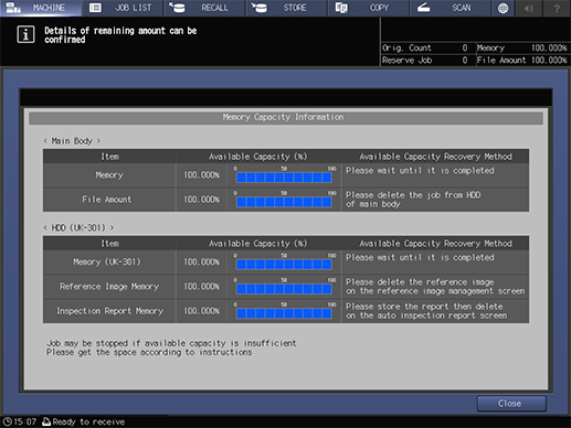 If there is not enough space, the job may be suspended. Follow the instructions of [Available Capacity Recovery Method] to increase the amount of available space.