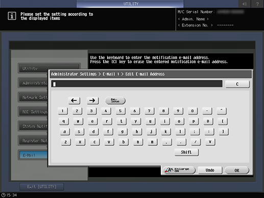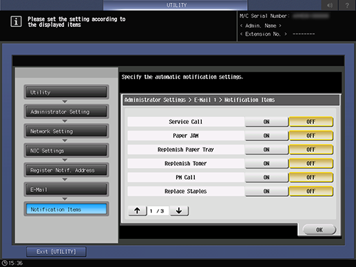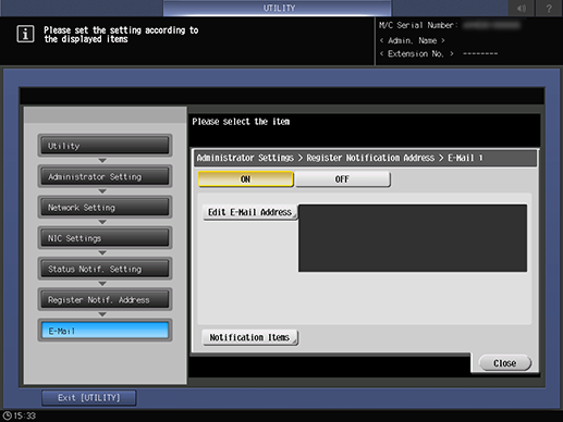 Set the email address to send the notifications to and the [Notification Items] ( [Auto Inspection] in this case) by accessing, in order, Control panel, Utility/Counter, [Administrator Setting], [Network Setting], [NIC Settings], [Detail Settings], [Status Notification Setting], [Register Notification Address], [E-mail 1] to [E-mail 5], and then [ON].