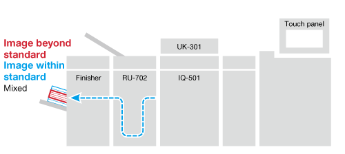 This section uses an example in which the printed items on which an abnormality was detected are output to the same tray as regular print items. In such a circumstance, be sure to check the automatic inspection report, and reprint and replace manually as necessary.