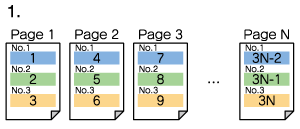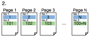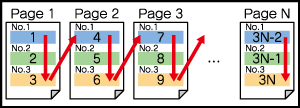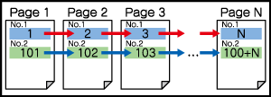 2 | [Check the data between pages] | Check that the decoding results for each area number are arranged sequentially between the paper sheets. In the example used in Figure 2, the decoding results for Area No. 1 across the pages are arranged correctly as 1, 2, 3, and so there is no problem. Next, check the same for Area No. 2. In this case, the decoding results are arranged correctly as 101, 102, 103, and so there is no problem. |