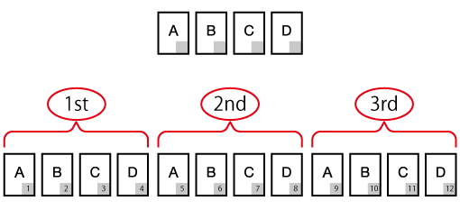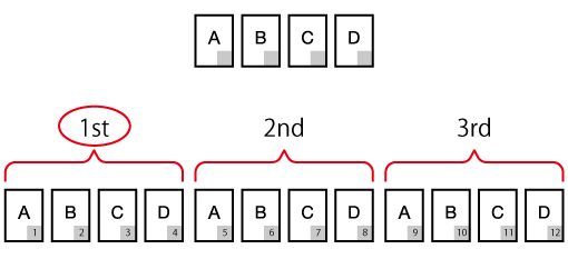 The diagram shows that if there are 12 sheets in the variable job, inspection will be carried out 3 times; once for every 4 reference images (A, B, C, D). The number of inspections will be repeated depending on the number of sheets in the given job.