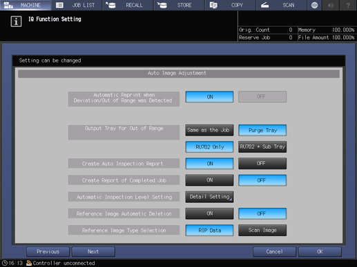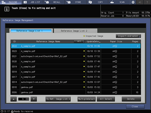 The printed data is also registered and displayed as a reference image on the [MACHINE] and [Ref. Image Manage.] screens on the system’s Touch panel, as well as in [Reference Image List 1]. For details, refer to [Ref. Image Manage.] Screen.