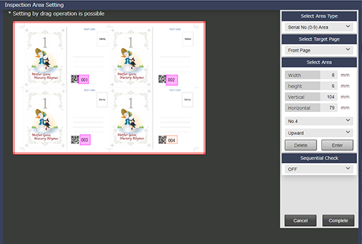 1 | [Check the data inside a page] | Check that the decoding results for the area number are arranged properly. Check that the decoding results for the final area number on the current page, and the decoding results for the first area number on the next page are arranged properly. For example, in the case of sheet number 1 and sheet number 2 shown in Figure 1, since the decoding results for Area No. 3 on sheet 1, and Area No. 1 on sheet 2 are arranged as 3, 4, there would be no problem. |