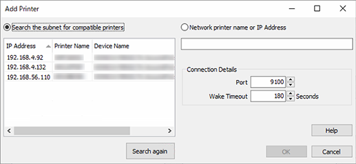 If no printers are displayed, configure [Port] and [Wake Timeout] in [Connection Details], and click [Search again].