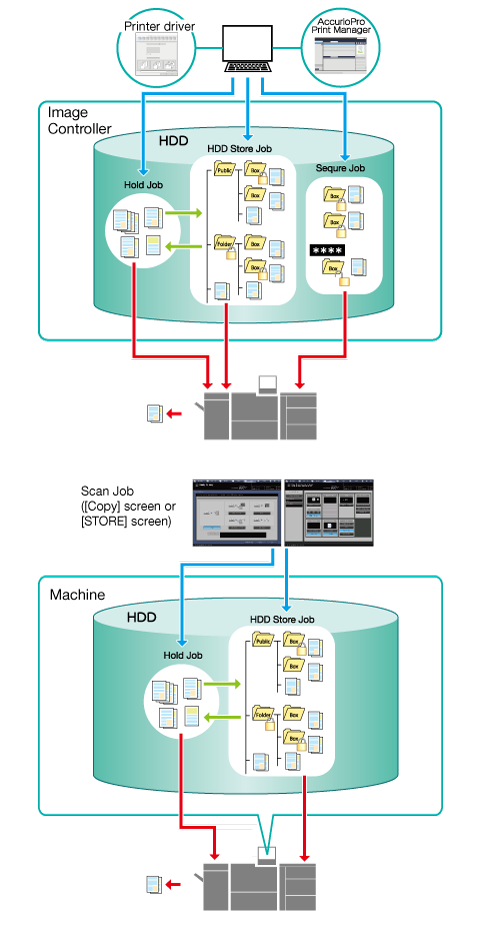 Print jobs sent from a computer can be stored as hold jobs, HDD jobs, or secure jobs on the Image Controller HDD. Stored jobs can be checked, edited, and/or printed using AccurioPro Print Manager.