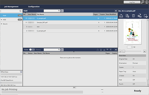 Use AccurioPro Print Manager to print secure jobs or hold jobs stored on the Image Controller HDD.