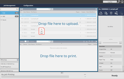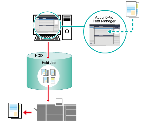 Use AccurioPro Print Manager to print after temporarily holding files from a computer on the Image Controller HDD.