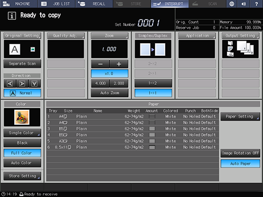 If interruption is available, [Ready to copy] is displayed in the message display section, and the Interrupt LED flashes. The [COPY] tab is changed to the [INTERRUPT] tab.