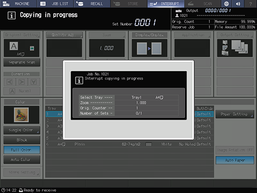 Pressing Interrupt on the Control panel when outputting a job interrupts the job currently being executed, and allows you to prioritize another copy.