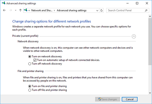 [Network discovery] can be checked by clicking [Network and Sharing Center] in [Control Panel], and then [Change advanced sharing settings].