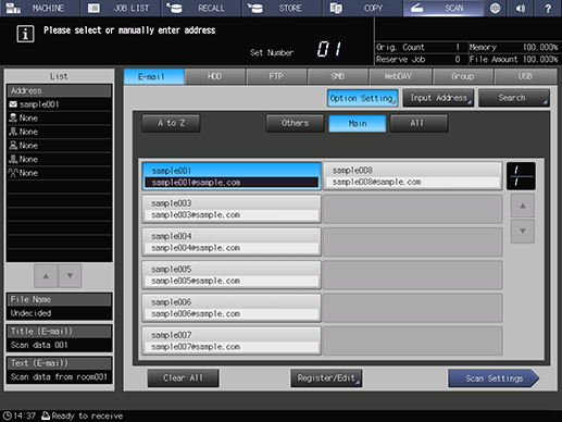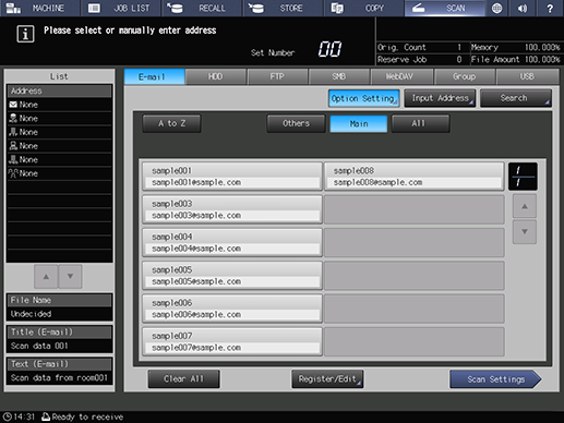 You can register up to 450 email addresses. For details about registering an address, refer to [Scan Address Register].