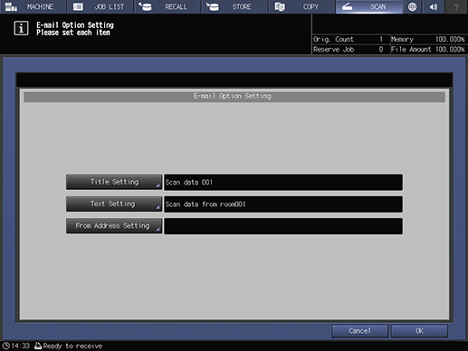If you do not set a title and body in [Option Setting], the content set to [Default] in [E-mail Title Setting] and [E-mail Text Setting] is applied. This is blank when [E-mail Title Setting] and [E-mail Text Setting] are not configured.
