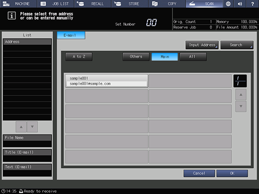 Press [Input Address] to manually enter the address. For details about entering a destination, refer to Sending to an Unregistered Email Address.