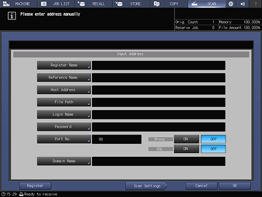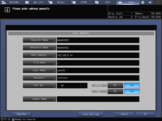 You can register up to 30 WebDAV destinations. For details about registering a destination, refer to [Scan Address Register].