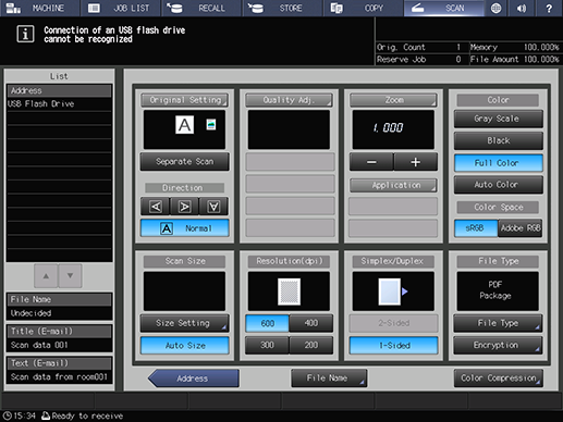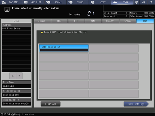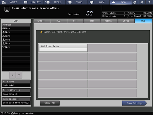 The destination or [Scan Settings] screen settings may not be deselected even after sending. It is recommended that you deselect settings and the destination once the operation is finished. On the [Scan Settings] screen, press Reset on the Control panel to deselect the settings. You can also deselect the destination by pressing [Clear All] on the [SCAN] screen, or by pressing Reset on the Control panel.