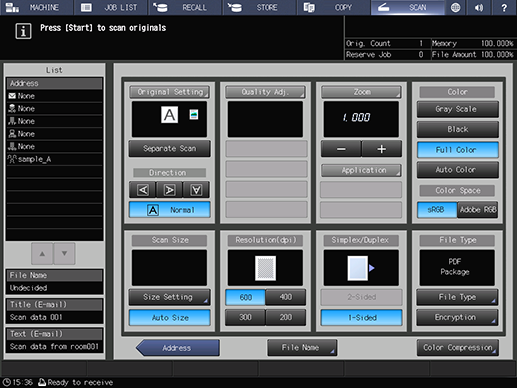 The destination or [Scan Settings] screen settings may not be deselected even after sending. It is recommended that you deselect settings and the destination once the operation is finished. On the [Scan Settings] screen, press Reset on the Control panel to deselect the settings. You can also deselect the destination by pressing [Clear All] on the [SCAN] screen, or by pressing Reset on the Control panel.