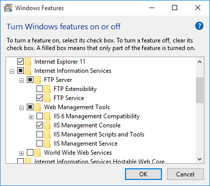 Add a check to [FTP Server] and [FTP Service] in [Internet Information Services], [Web Management Tools] and [ISS Management Console], and then click [OK].