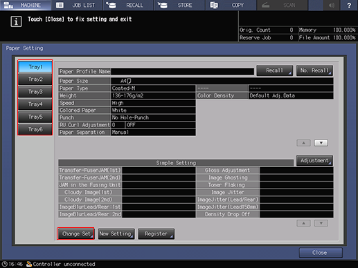 Press [Paper Setting] on the [MACHINE] screen, select the tray loaded with the paper you want to perform the adjustments with, and then press [Change Set].