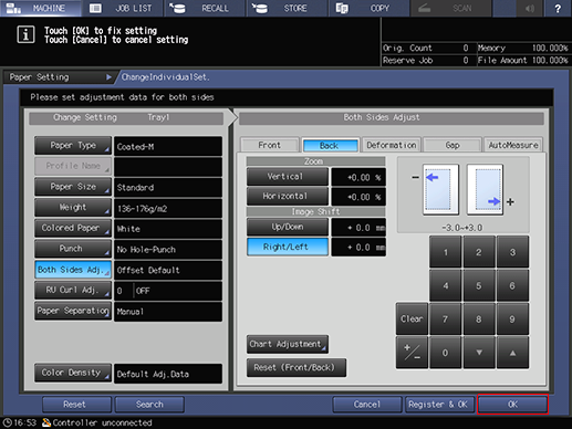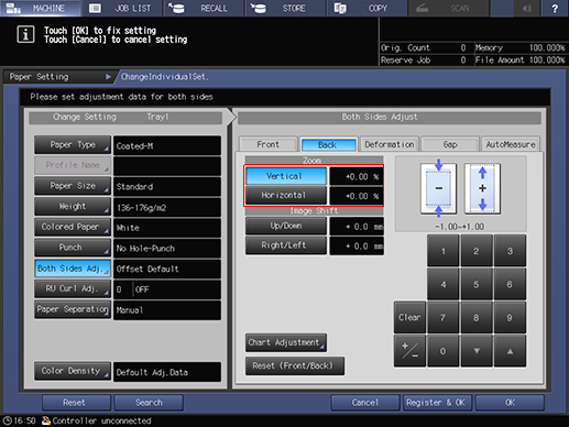 If the spacing on the front side and back side images are inconsistent, enter the adjustment values into [Vertical] (cross direction) and [Horizontal] (feed direction).