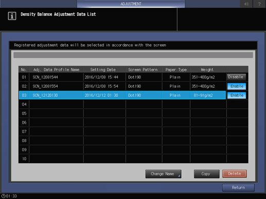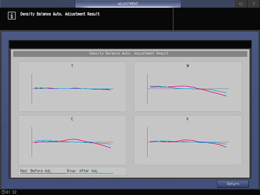 When [No] is selected, a list of density balance adjustment values is displayed. Press [Return] to return to the [Density Balance Auto. Adjustment] screen.