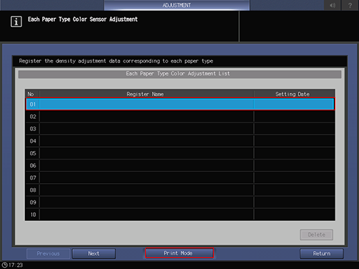 Select a number for registering the output density adjustment value, and press [Print Mode].