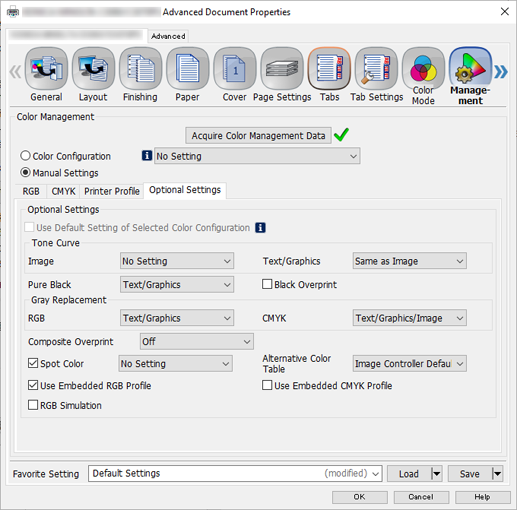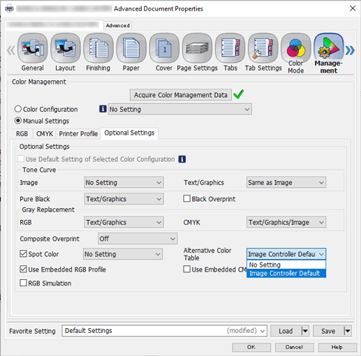 If [Alternative Color Table] is not set to [Enabled], uncheck [Use Default Optional Settings], and select a table to be used for the [Alternative Color Table].