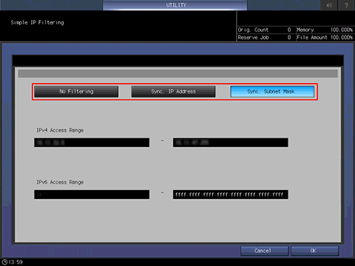 If using IPv4, only addresses which are within the permitted range of IP addresses are allowed. The subnet mask is fixed at 255.255.255.0. If using IPv6, only IP addresses configured to the machine or Image Controller, and IP addresses with the same high-order 64 bits are allowed access.