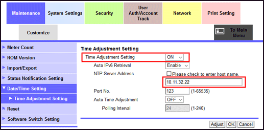 Here, "10.11.32.22", the IP address of the NTP server for the external server constructed on Constructing Active Directory on Windows, has been entered.