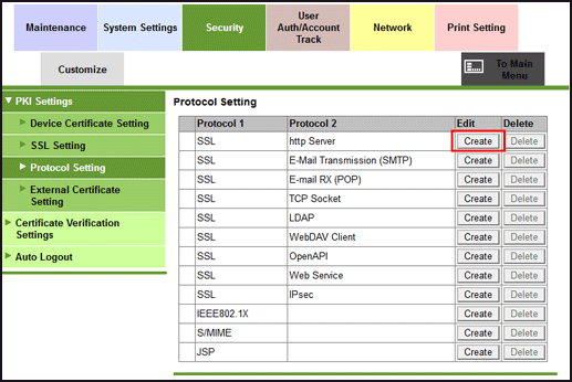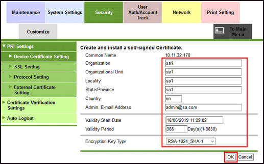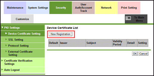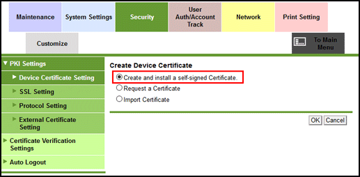 This section shows the creation of a certificate on the machine while logged in to Web Connection as the administrator.