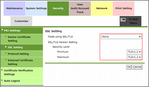 For [SSL/TLS Version Setting], it is recommended that you set [Minimum] to [TLSv1.0], and [Maximum] to [TLSv1.3].