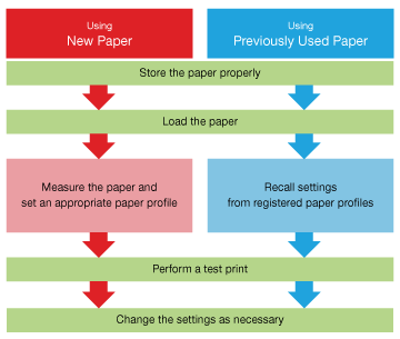 "Previously used paper" refers to paper that has a paper profile registered on the system. Even if the paper type and weight are the same, if the paper manufacturer and paper brand name differ, the paper characteristics may differ in the details. When using new paper, it is recommended to register a new paper profile.