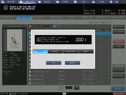 Select the desired one from [Normal], [Proof], [Proof(1st)], and [Wait], enter the number of copies using the keypad on the control panel, then press [OK].