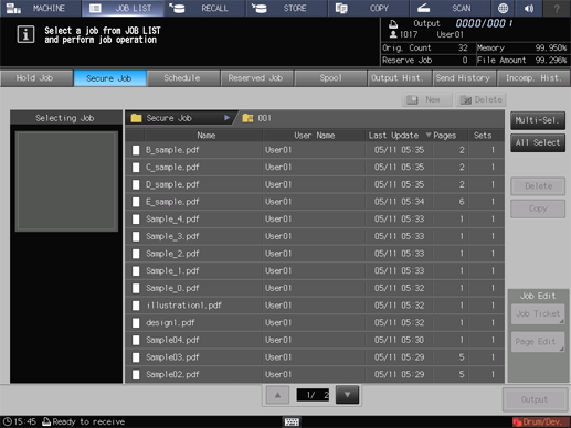 For details about job editing functions on the [JOB LIST] screen, such as Save in Hard Disk, refer to Editing Hold Job.