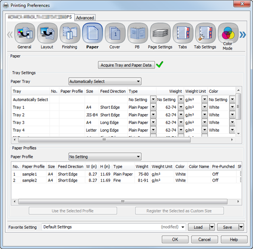 • When is displayed at the right of [Acquire Tray and Paper Data], the tray and paper information has been acquired.