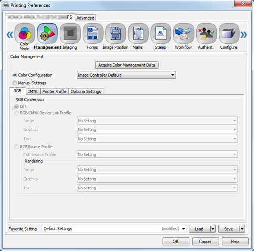 [Acquire Color Management Data] | - | Click this to obtain information on color configuration, profile, tone curve, and default setting registered in the image controller. |