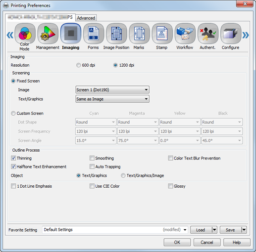 [Smoothing] | Off, On | When turned on, you can smoothly print the outline of text with density of 100%, such as K=100%, and line images. The smoothing function is applied only to the part of primary colors (C, M, Y, or K). It is not applied to the area with mixed colors. The [Smoothing] setting is available when [Fixed Screen] is selected. |
