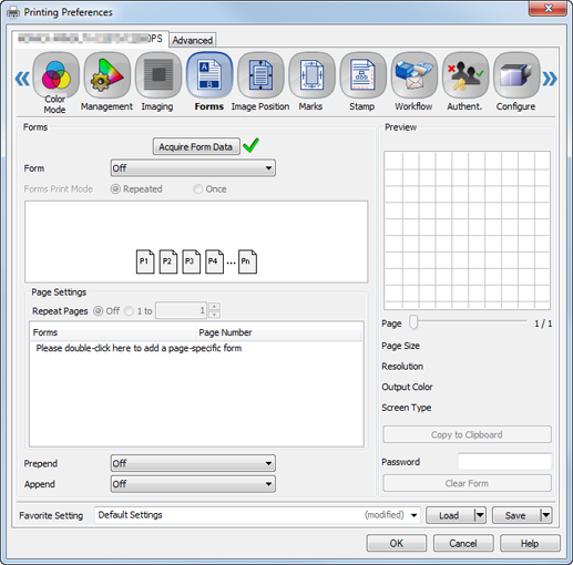 [Forms Print Mode] | [Repeated], [Once] | Select [Repeated] to overlay all form pages repeatedly in order from the first page on a printing document. Select [Once] to overlay all forms pages only once in order from the first page on a printing document. |