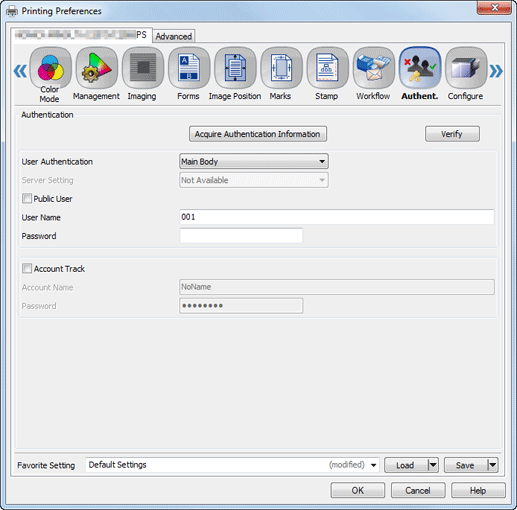 [Verify] | - | You can preliminarily verify Authentication/Account Track for whether or not the current input value is authenticated at the actual printing. |