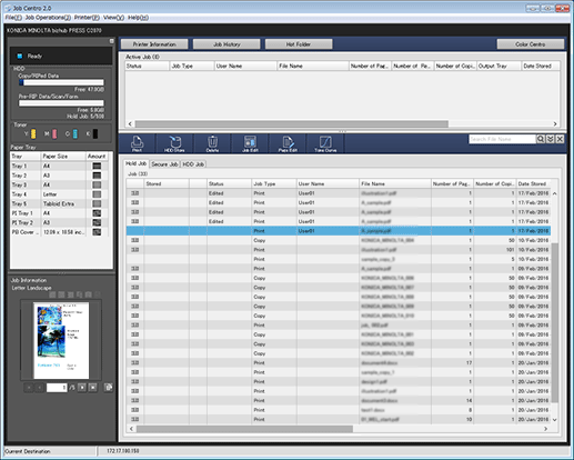 Displays in graph form and in numerical values the used amount and the free space for copy and RIPed data used for the job, and also those for Pre-RIP data, scan, and form. The number of the hold jobs is also displayed.