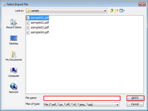 Available file types to be imported are PS, PDF, TIFF, TIF, JPEG, JPG, ZIP, and PPML.