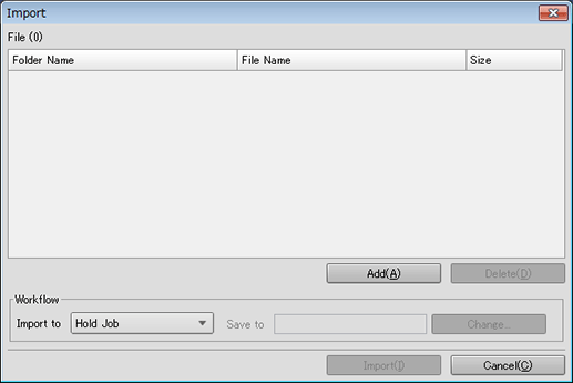 [Import to] | Select one of Hold Job, Hold Job (Without RIP), Secure Job, and HDD Job. If the permission mode is set to ON only for Secure Print, a secure job is only selectable. [Hold Job]: Imports a file to a hold job. [Hold Job (Without RIP)]: Imports a pre-RIP file to a hold job. [Secure Job]: Imports a file to a secure job. Select the destination Box name. [HDD Job]: Imports a file to an HDD job. Select the destination folder name or Box name. |