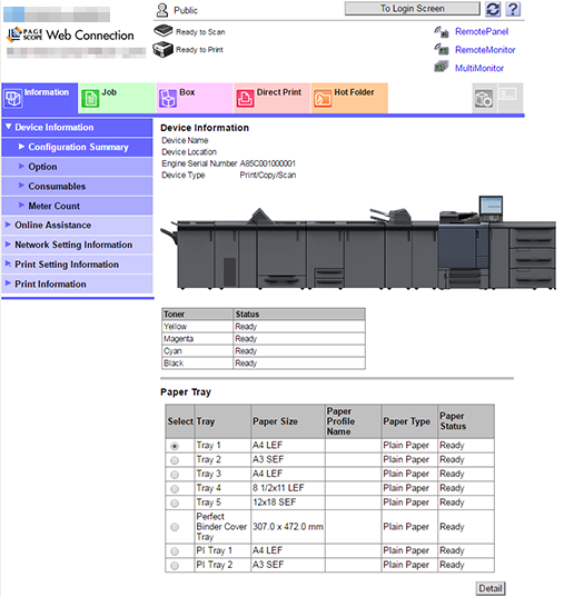 PageScope Web Connection is a device control utility program. This utility allows you to display the status of the printer, scanner, and network, perform the machine maintenance or to make the security, printer, scanner, and network settings via a Web browser.