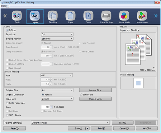 The setting items here are the same as those of the "Layout" screen of the PS Plug-in driver except the settings of [Poster Printing]. For the description of the common setting items, refer to Layout.