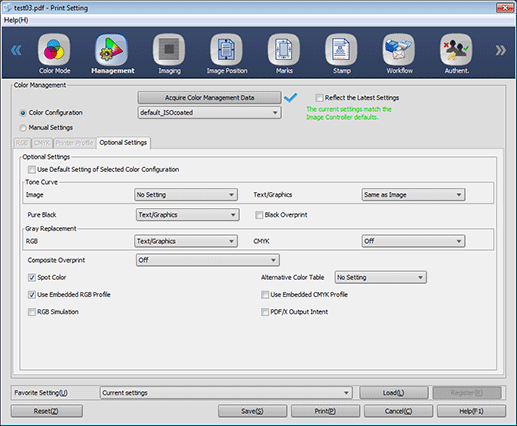 When a tone curve adjustment is applied to the [Image] or [Text/Graphic] attribute with Color Centro, you must select [Management] - [Manual Settings] - [Optional Settings] - [Tone Curve], and then set [Image] or [Text/Graphics] to [Use Job Tone Curve].
